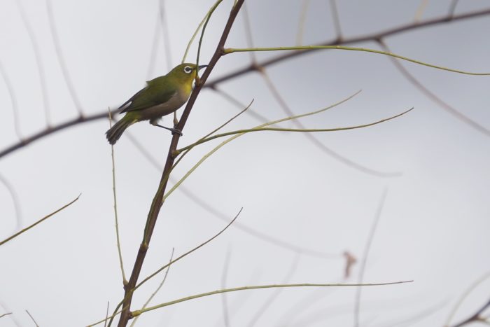 Japanese White-eye。全長 11.5 ㎝ ほどの留鳥で、日本で見られる野鳥の中では最小クラス(正確には、最小から3番目)です。室町時代から「メジロ」の名で呼ばれていました。