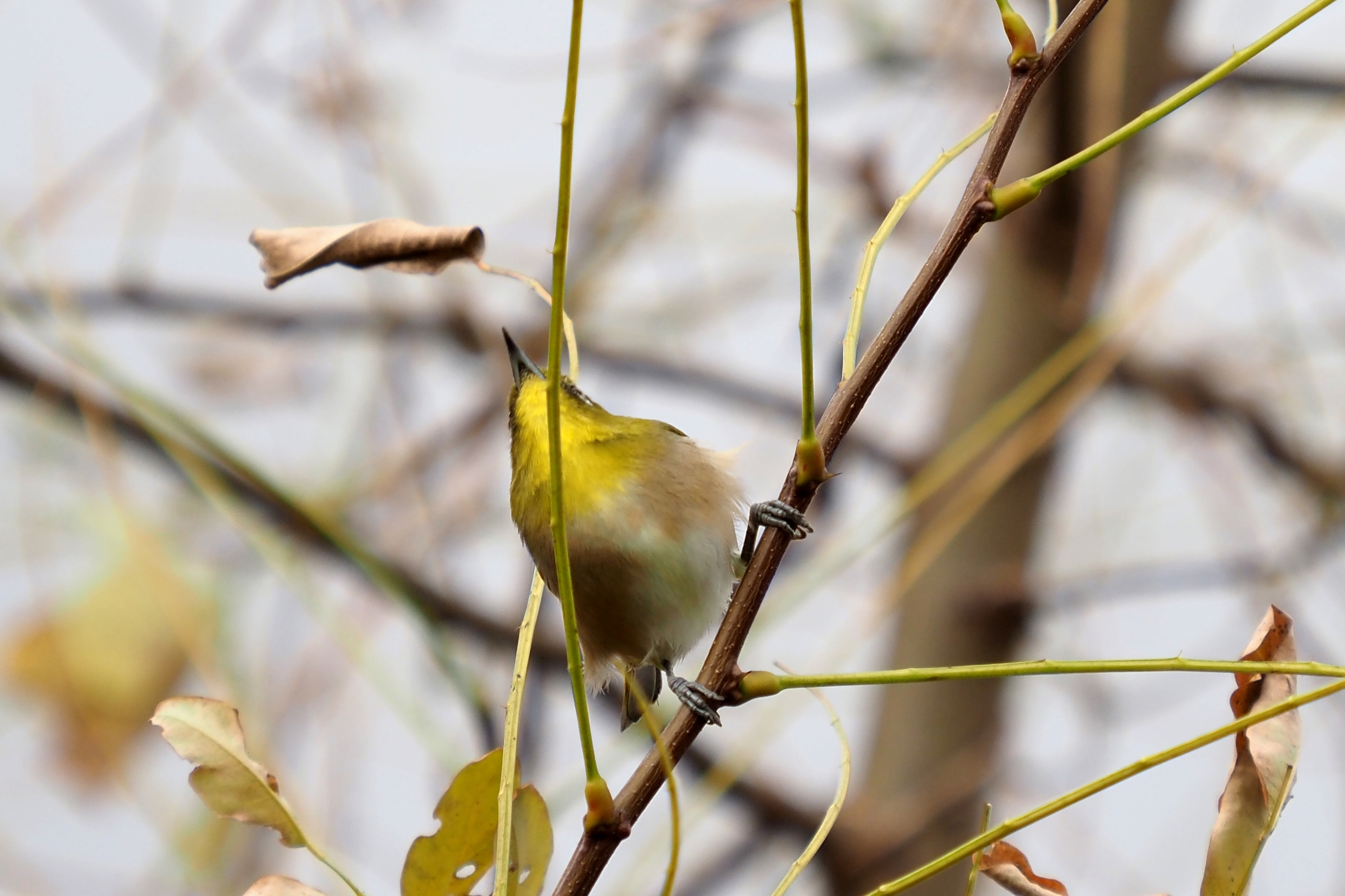 浅川堤防で、葉を落としたニセアカシアでエサ(今の時期は虫の幼虫)をさがしていました。
