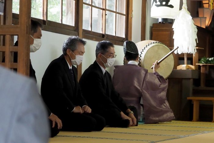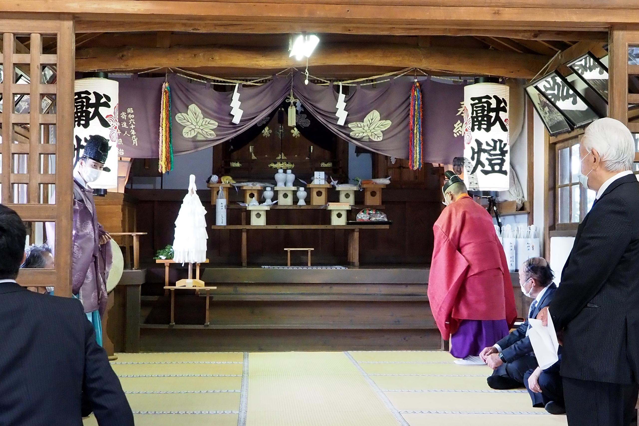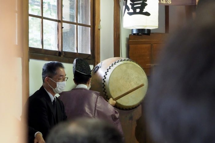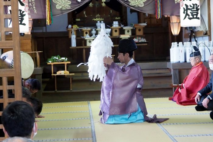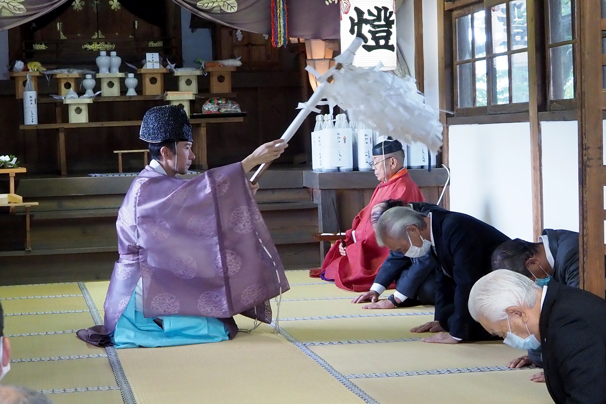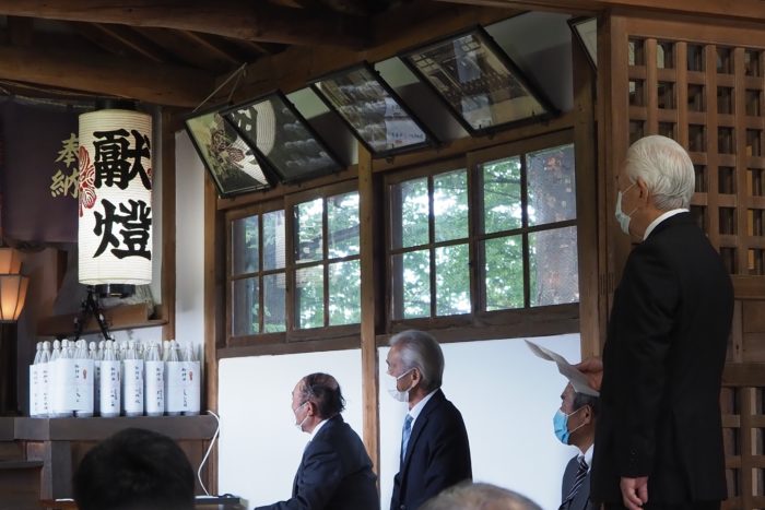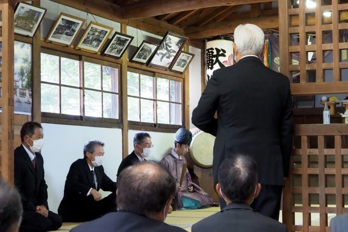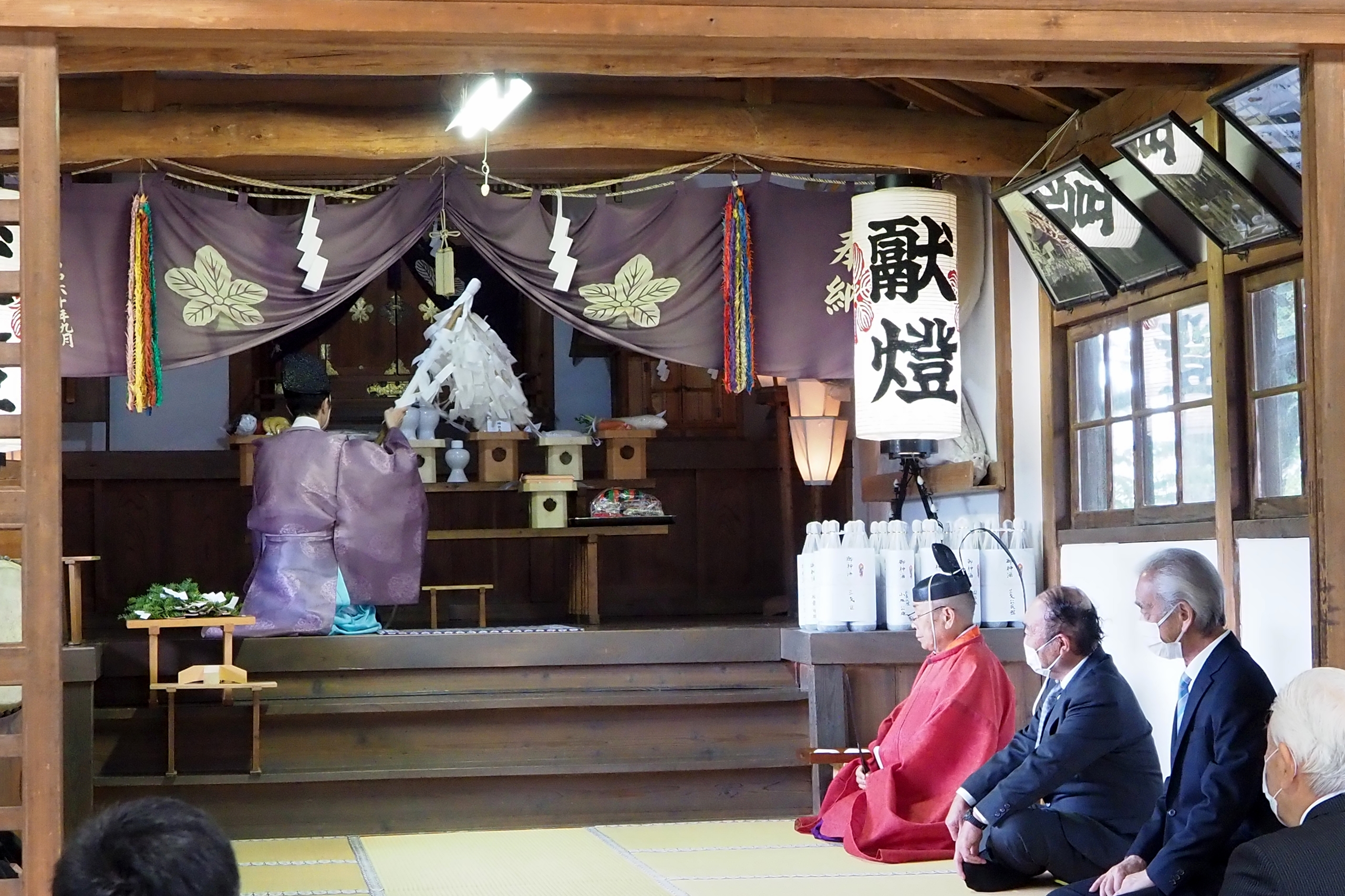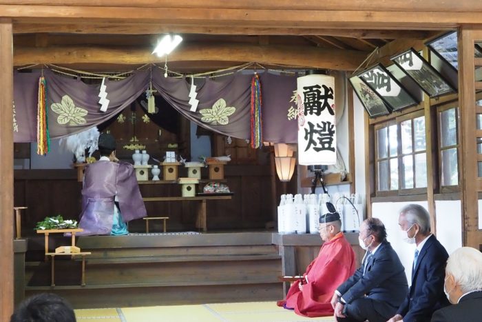 本降りの雨こそ止んだものの、まだ小雨が残る中、三才諏訪神社の例大祭が執り行われました。 昨年と同様に、新型コロナウィルスによる感染症拡大防止のため、野黒宮司、長沼宮司、そして役員の一部のみが出席する最小限の祭事となりました。 宵祭りがなく、獅子舞も神楽の奉納もないお祭りが普通になりつつある現状に、一抹の寂しさを覚えずにはいられませんでした。