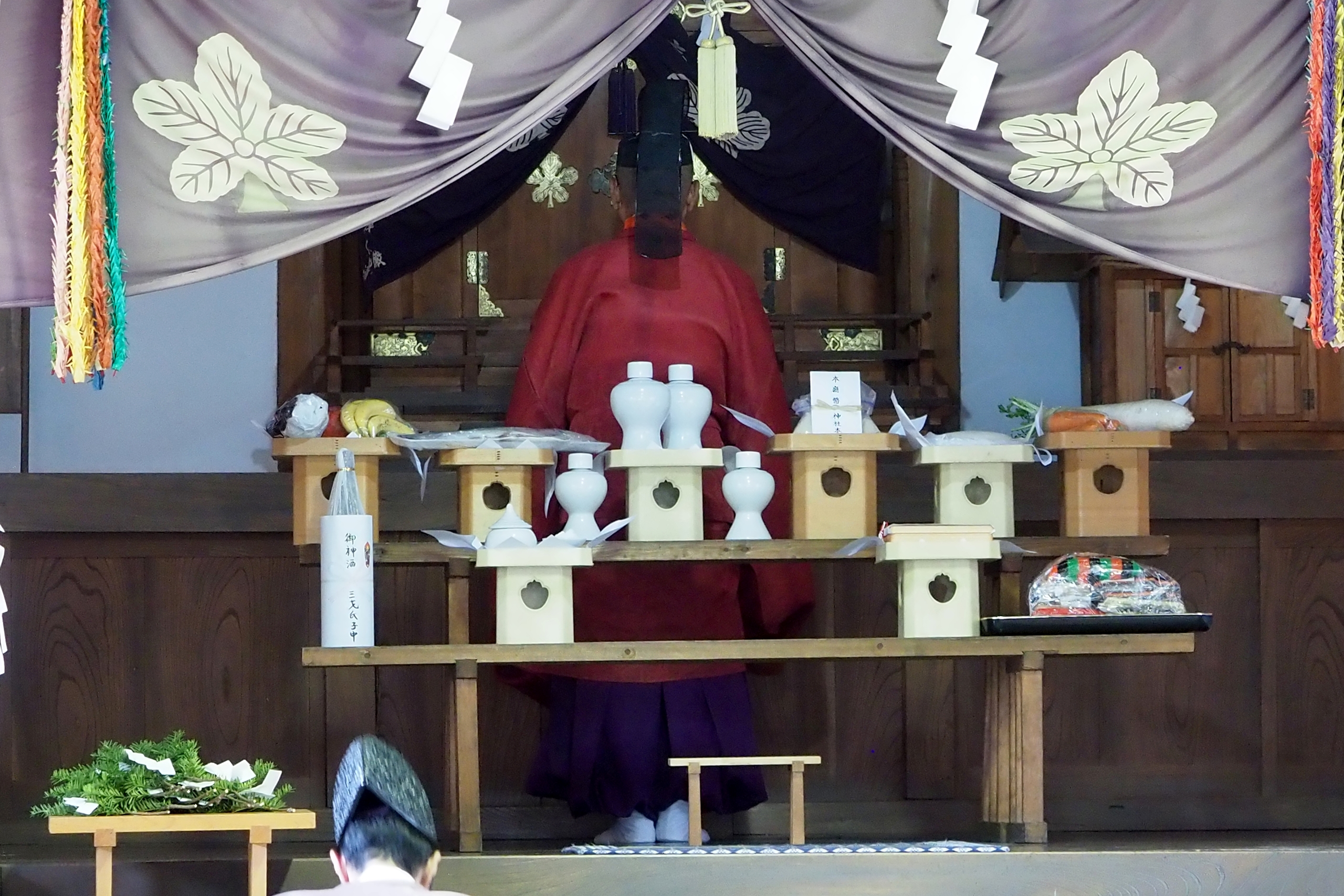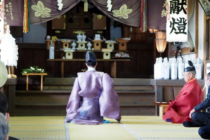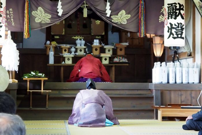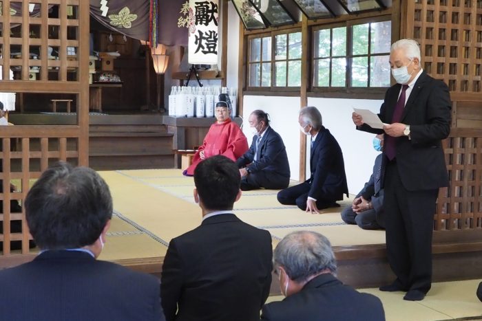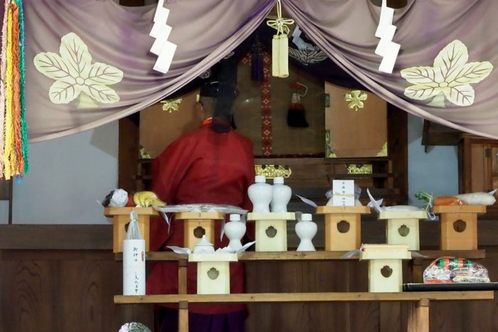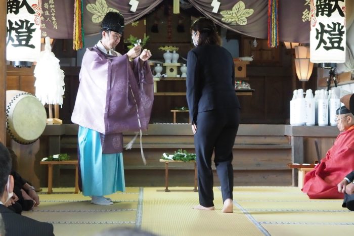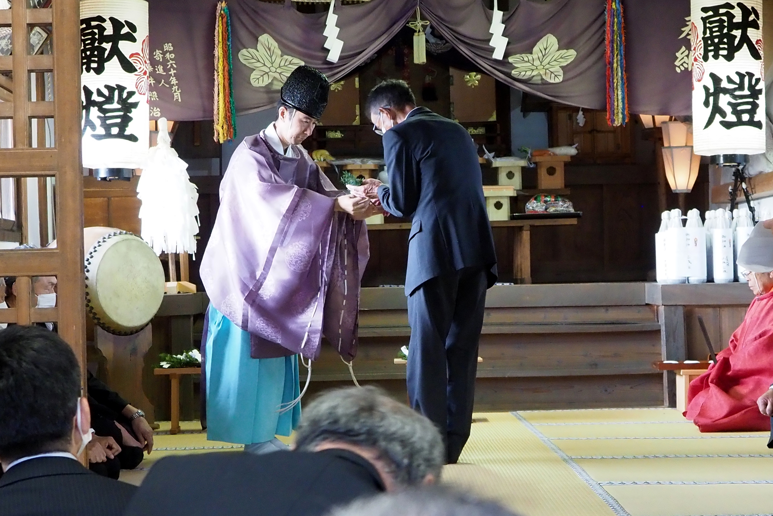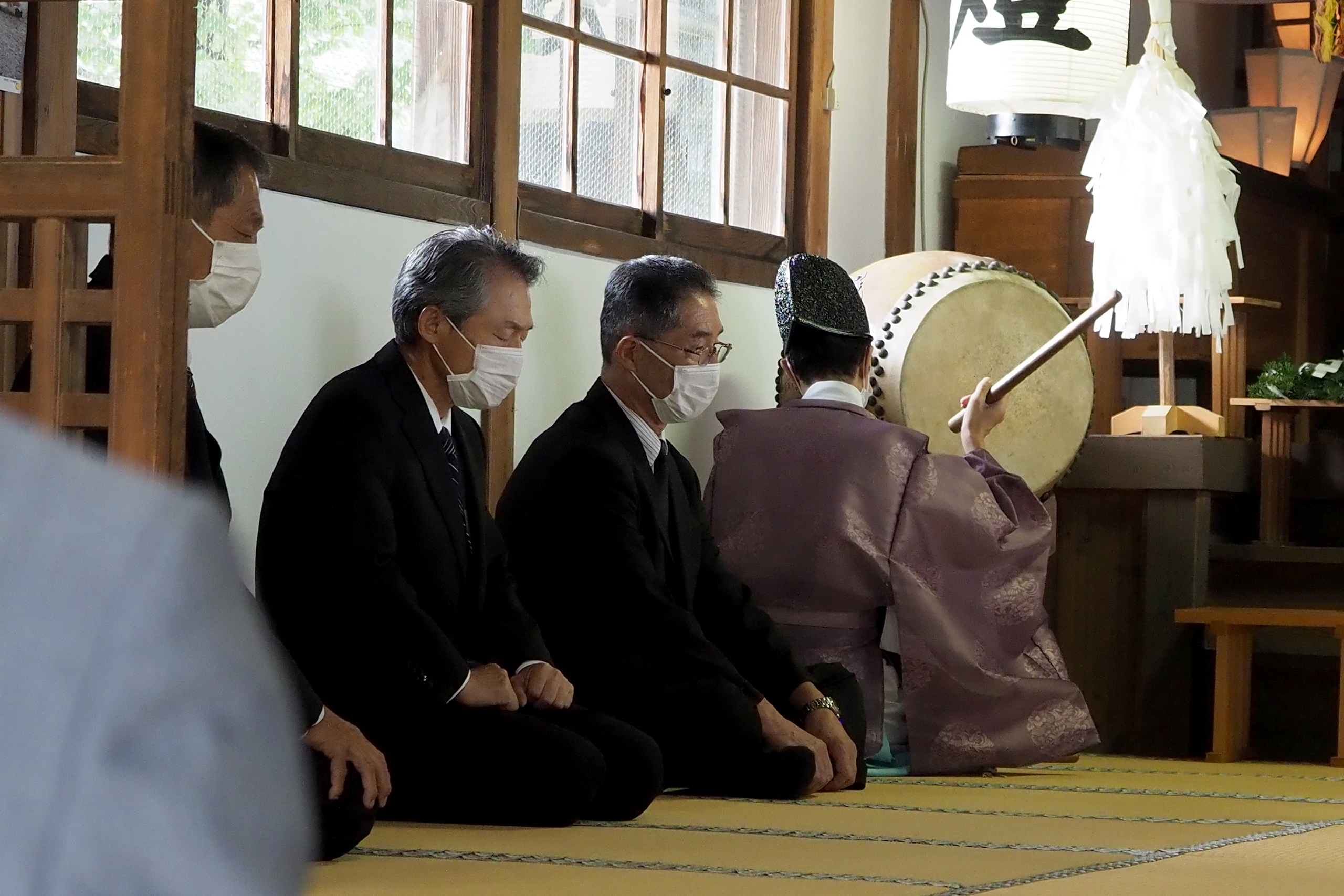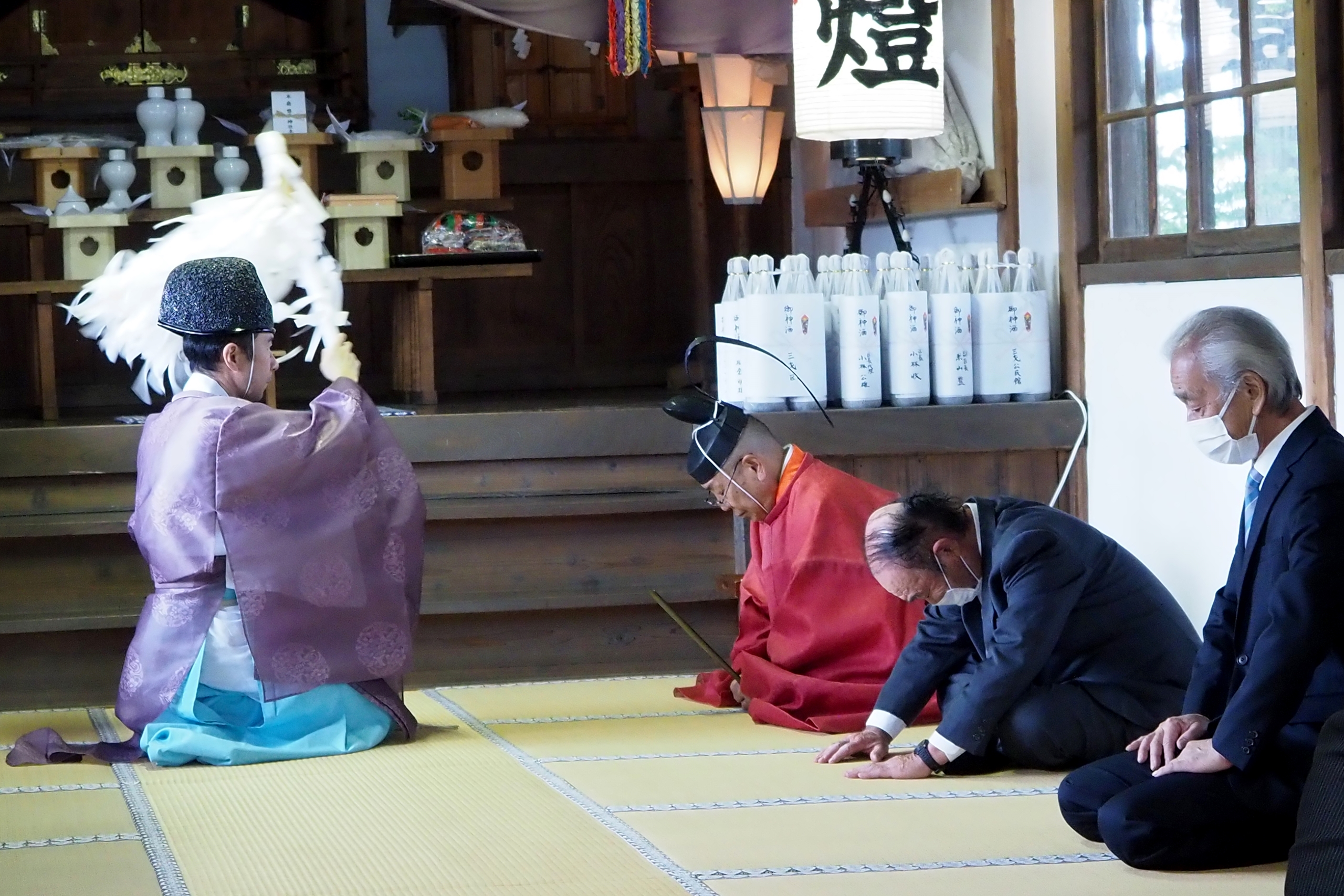 本降りの雨こそ止んだものの、まだ小雨が残る中、三才諏訪神社の例大祭が執り行われました。 昨年と同様に、新型コロナウィルスによる感染症拡大防止のため、野黒宮司、長沼宮司、そして役員の一部のみが出席する最小限の祭事となりました。 宵祭りがなく、獅子舞も神楽の奉納もないお祭りが普通になりつつある現状に、一抹の寂しさを覚えずにはいられませんでした。