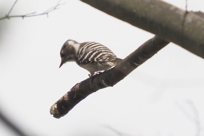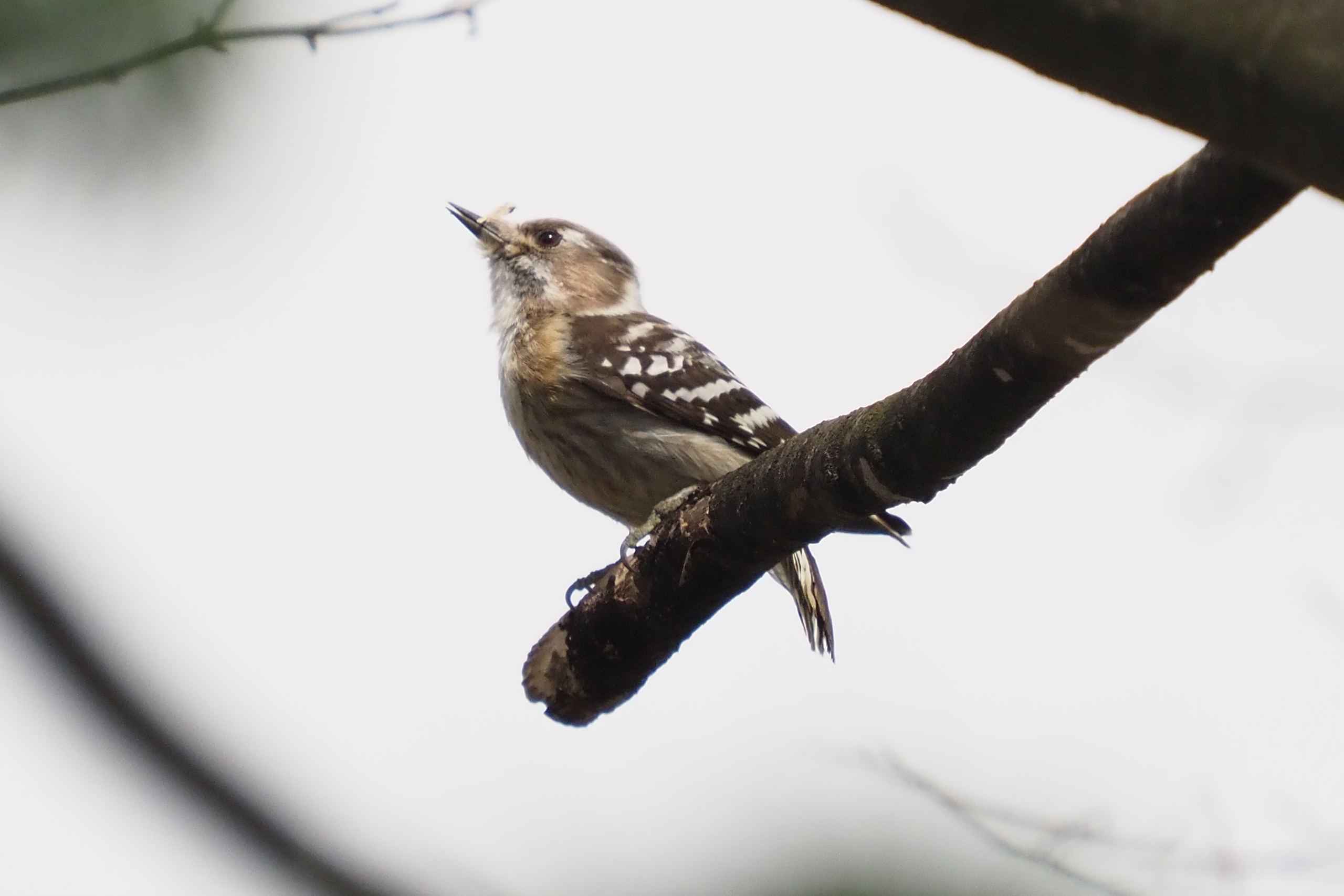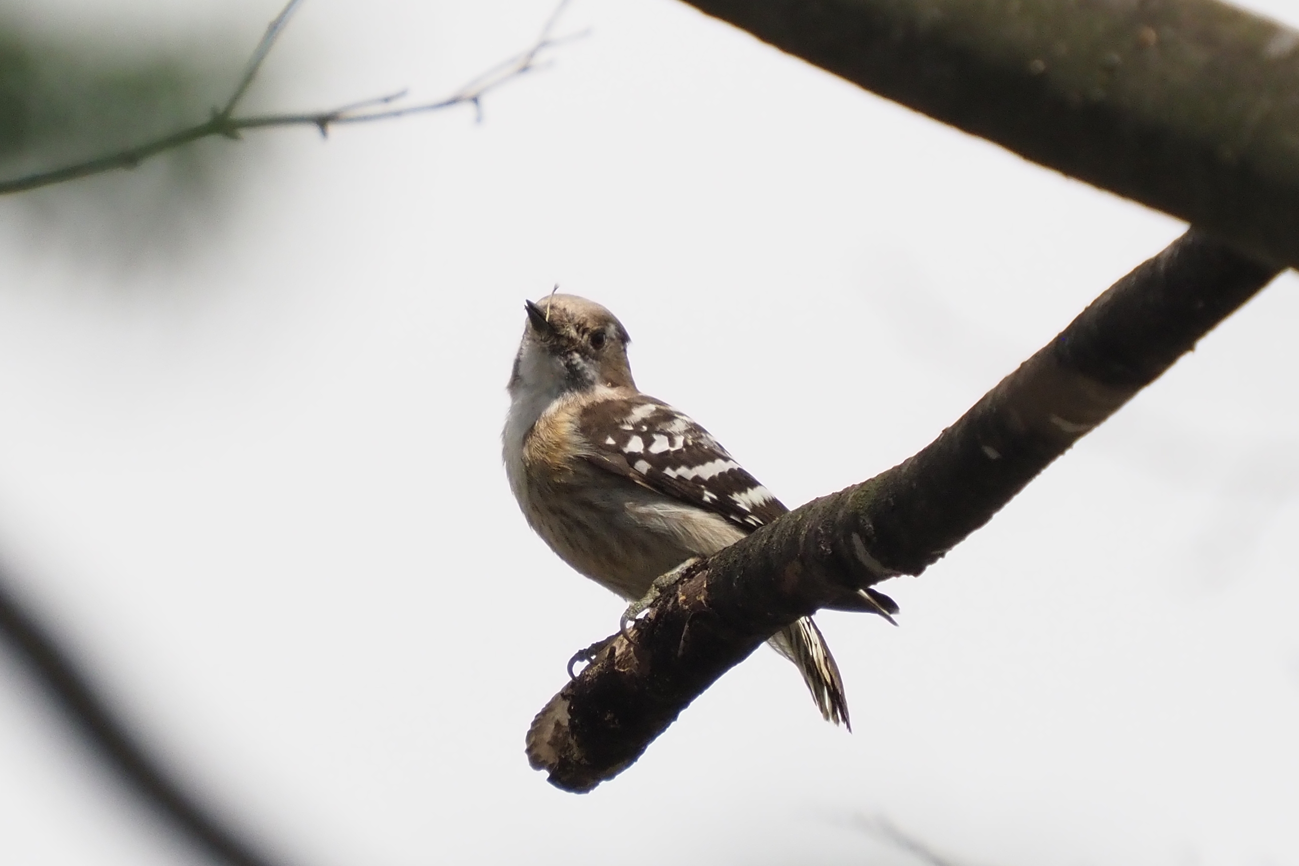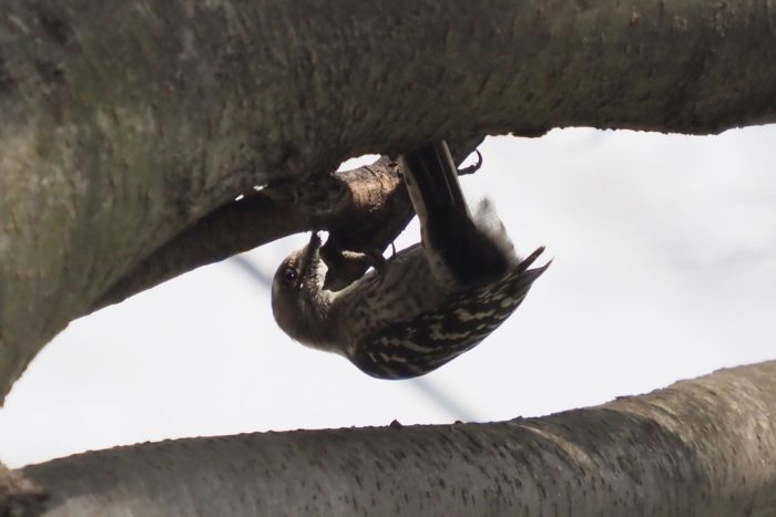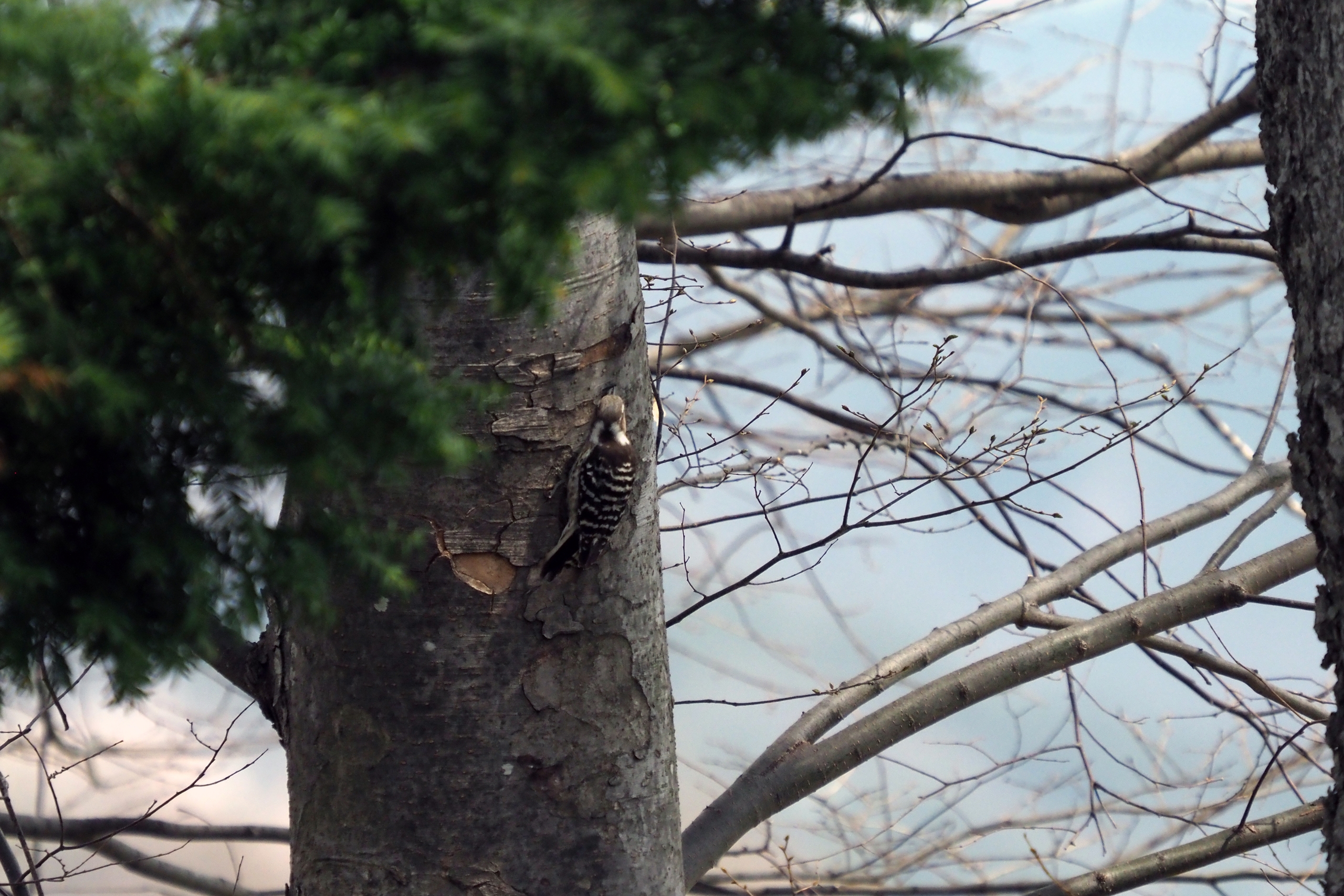 全長15cmほどなので、ほぼスズメと同じ大きさの留鳥です。日本で生息しているキツツキとしては最小です。オスは頭部の後ろ側にキズのように見える細い赤斑があります。 からだのサイズの割に縄張りが広くて、20haにも及ぶとされています。欅とか櫻がお気に入りのようです。