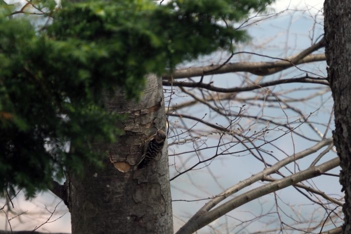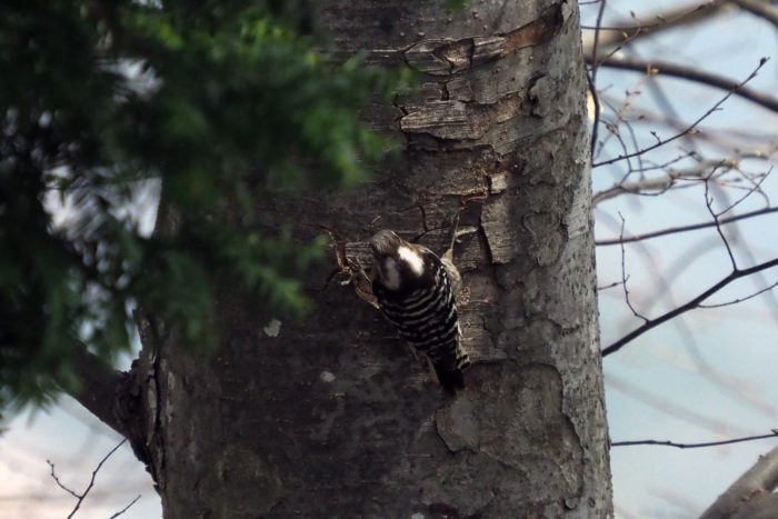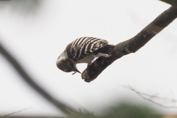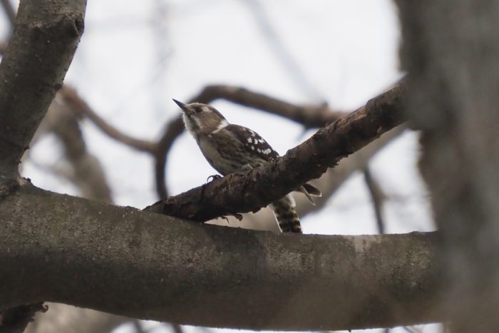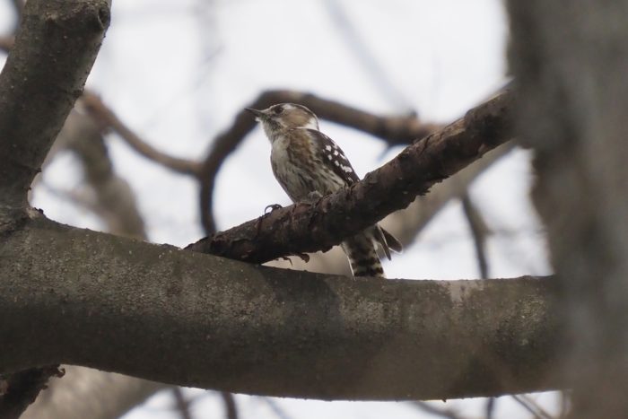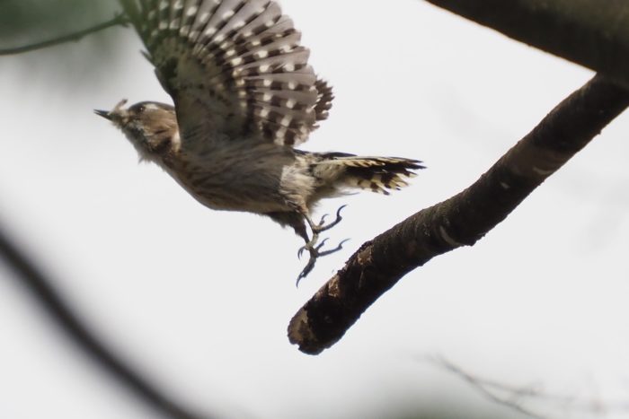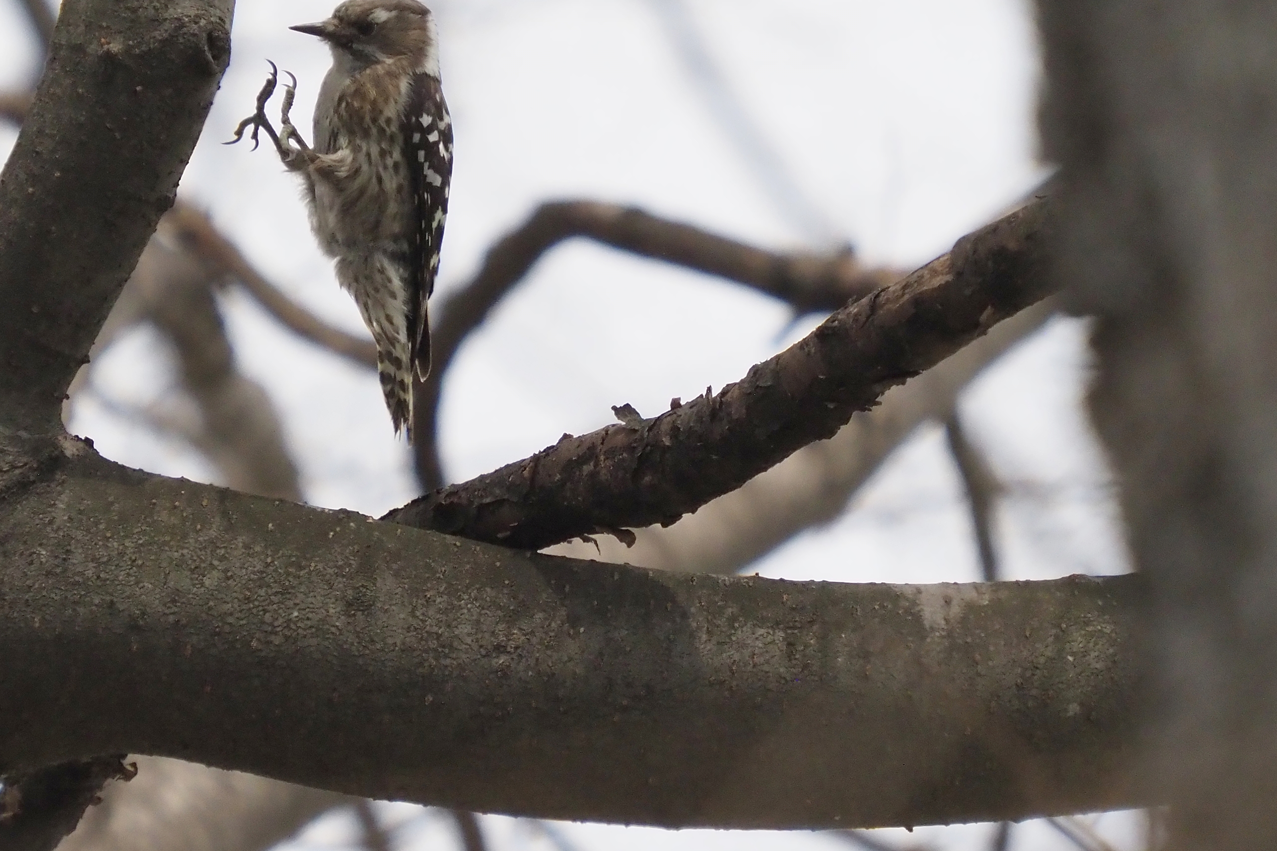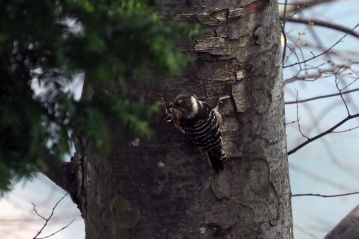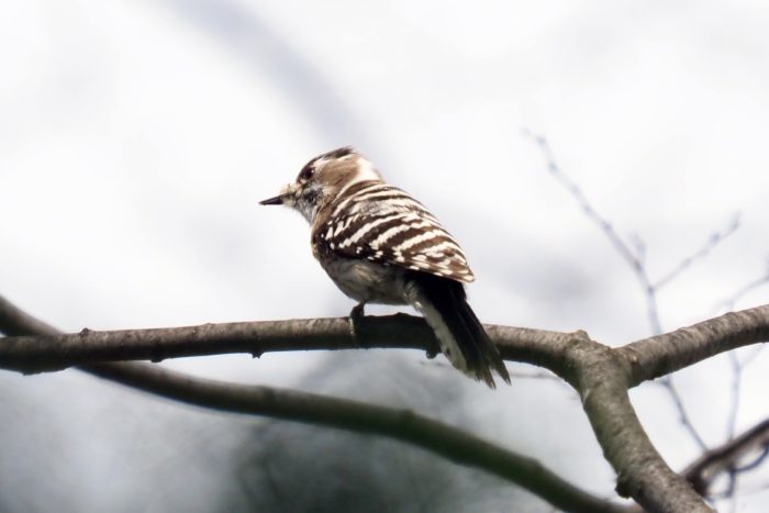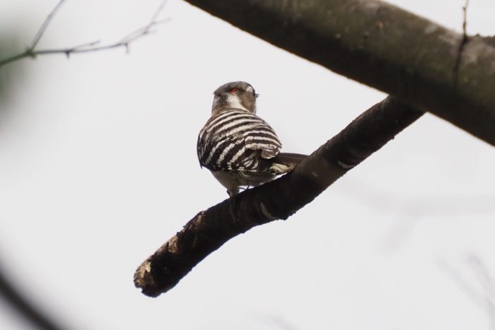 全長15cmほどなので、ほぼスズメと同じ大きさの留鳥です。日本で生息しているキツツキとしては最小です。オスは頭部の後ろ側にキズのように見える細い赤斑があります。 からだのサイズの割に縄張りが広くて、20haにも及ぶとされています。欅とか櫻がお気に入りのようです。