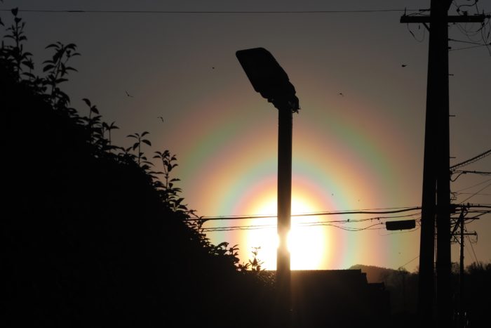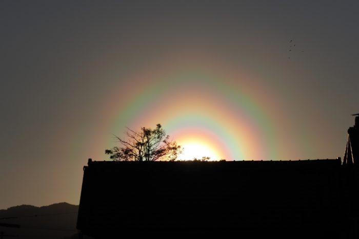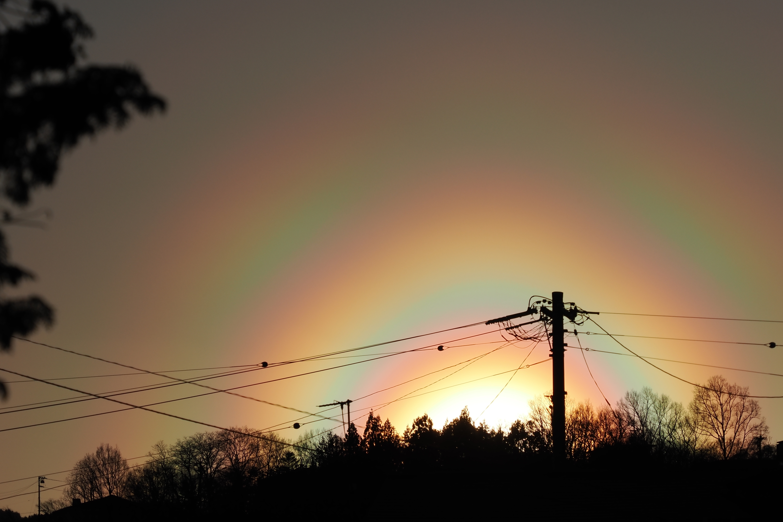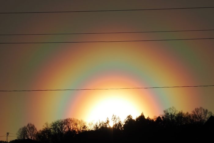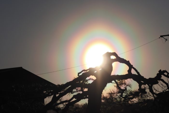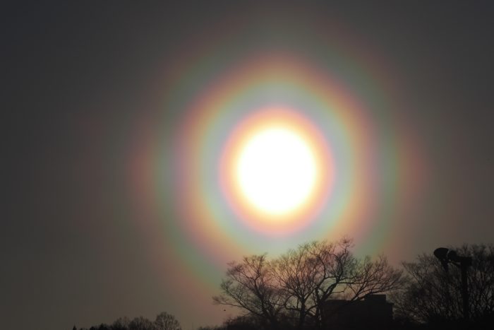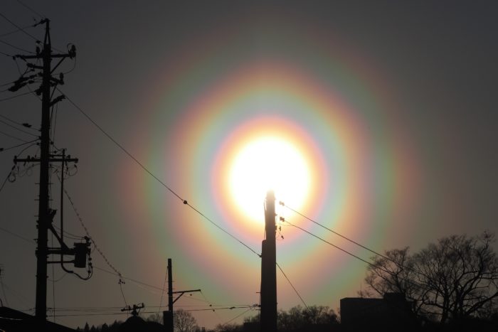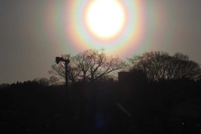 3月19日夕方の花粉光環です。 めったに見られないぐらい見事な(考えようによっては、とてつもなくおぞましい)虹状の環が西の空に描かれていました。夕方で光が弱かったこともあり、セオリーどおりに太陽付近に遮光物を入れなくても撮影することが可能でした。