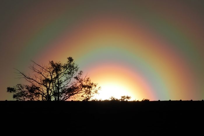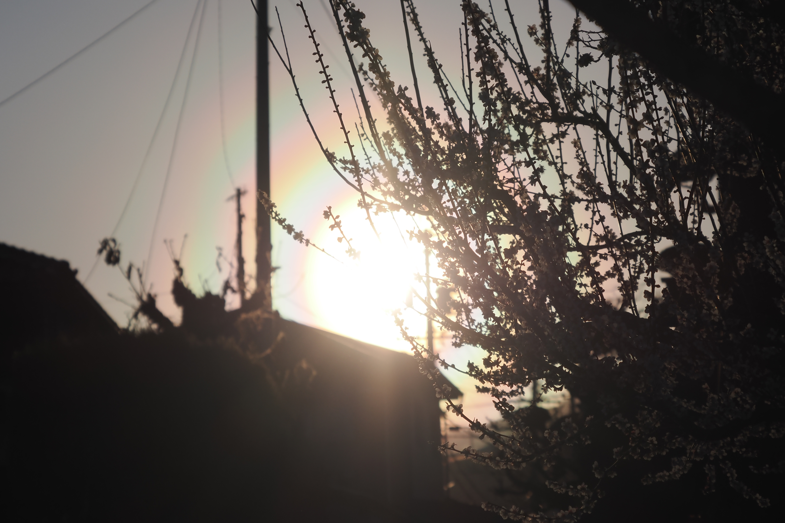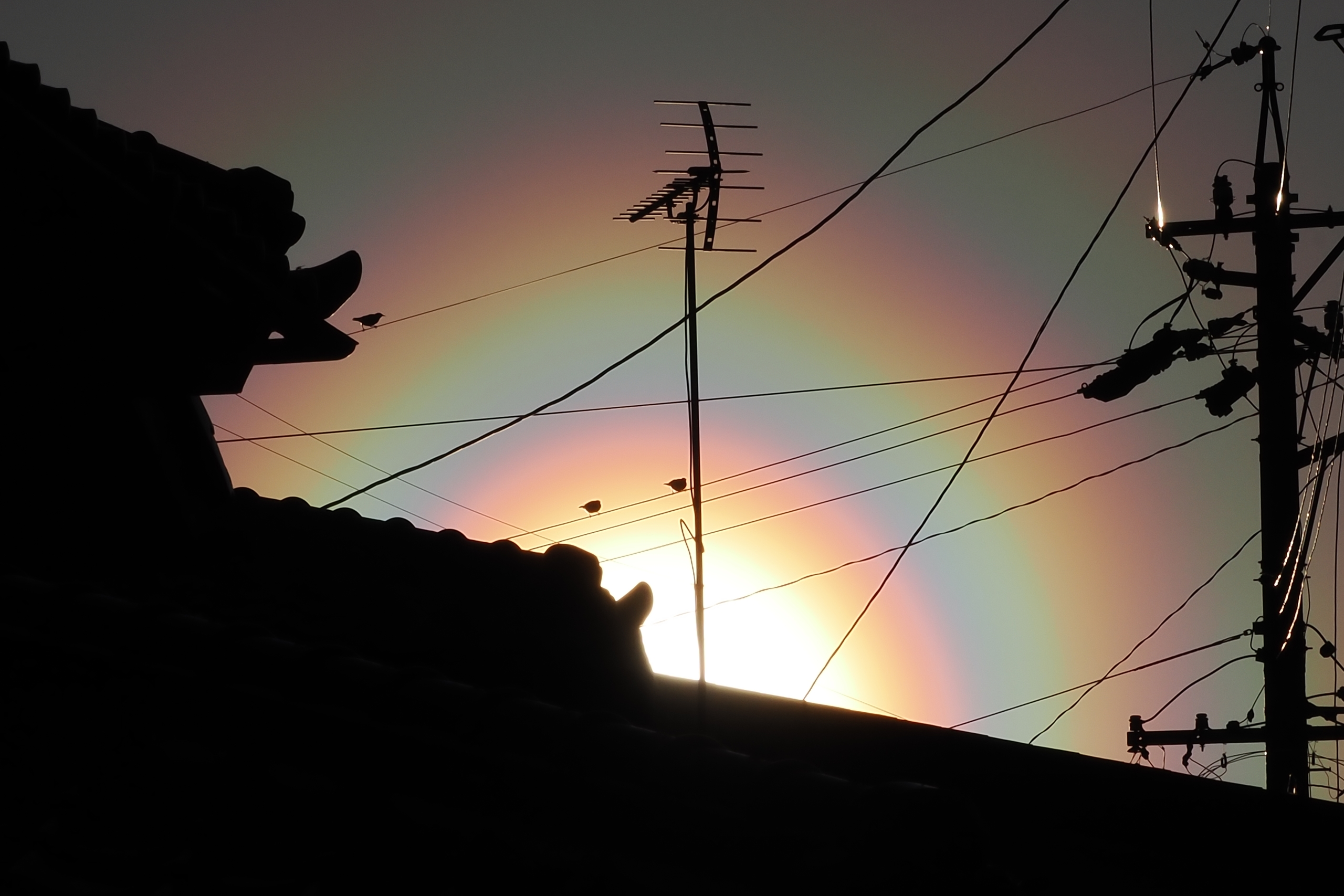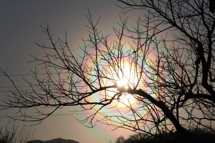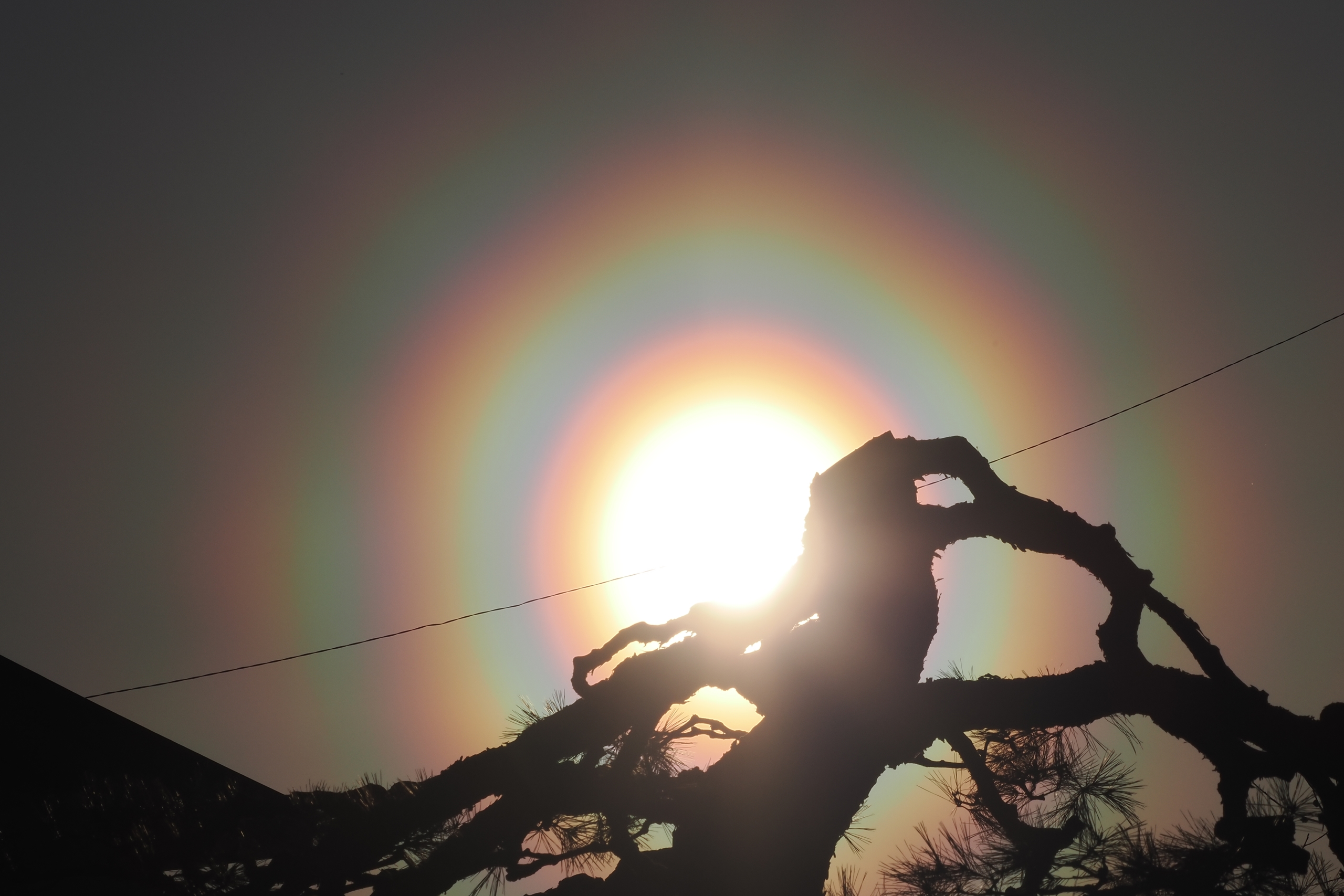 3月19日夕方の花粉光環です。 めったに見られないぐらい見事な(考えようによっては、とてつもなくおぞましい)虹状の環が西の空に描かれていました。夕方で光が弱かったこともあり、セオリーどおりに太陽付近に遮光物を入れなくても撮影することが可能でした。