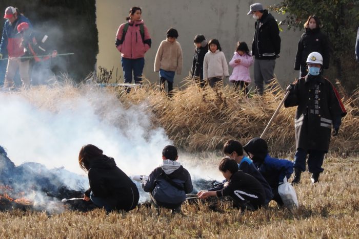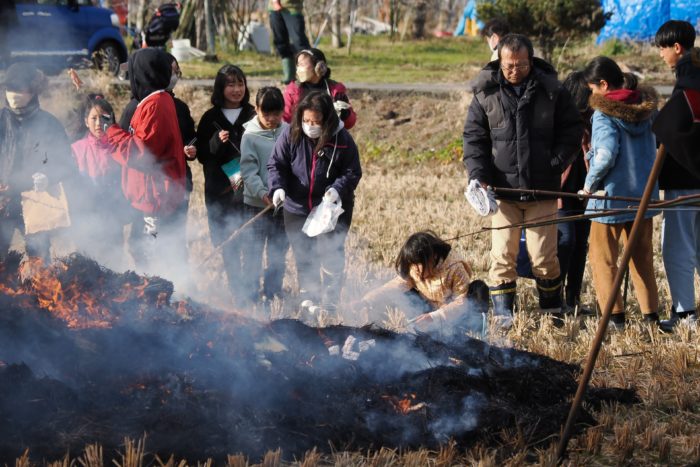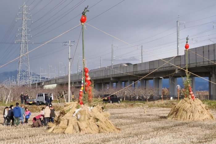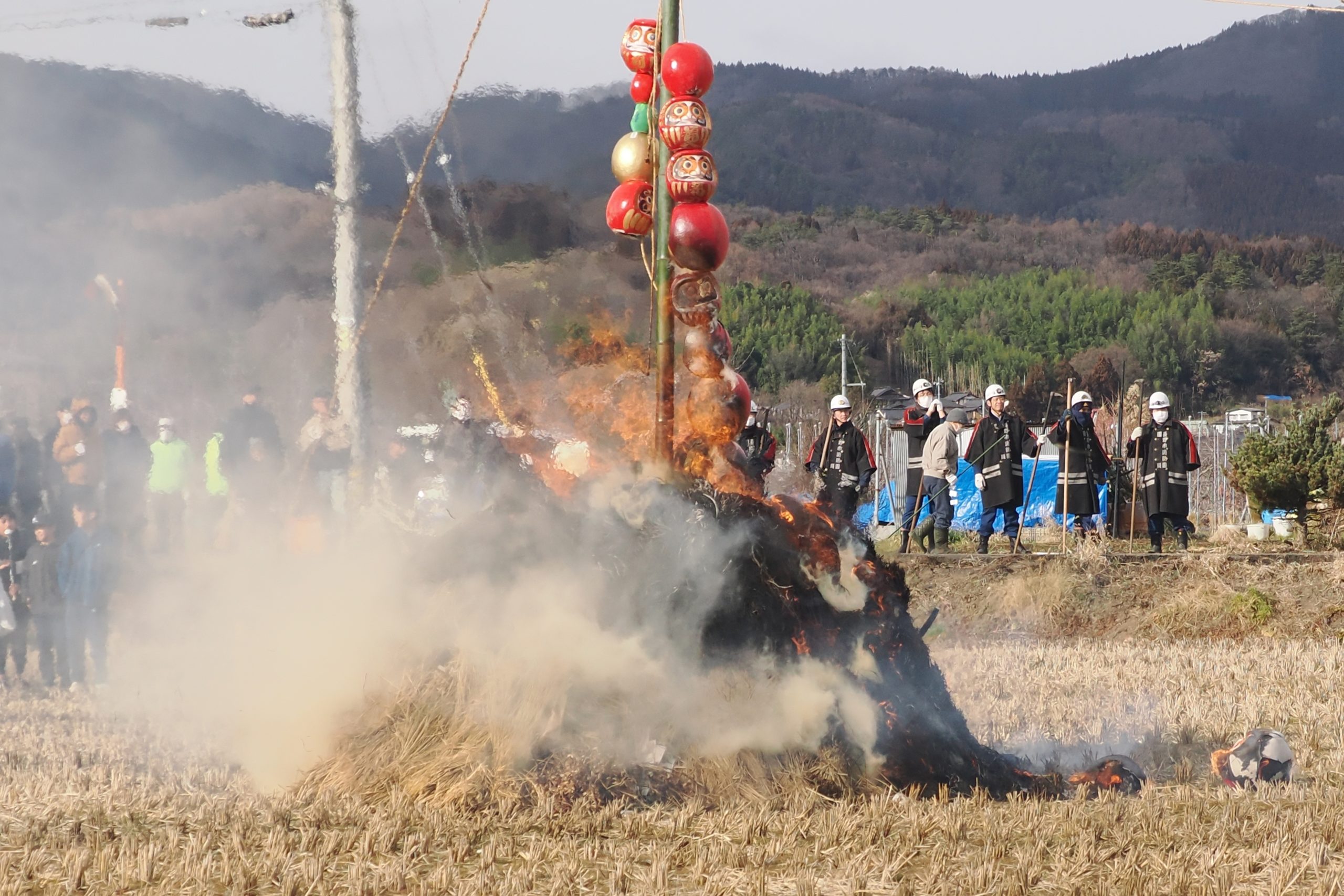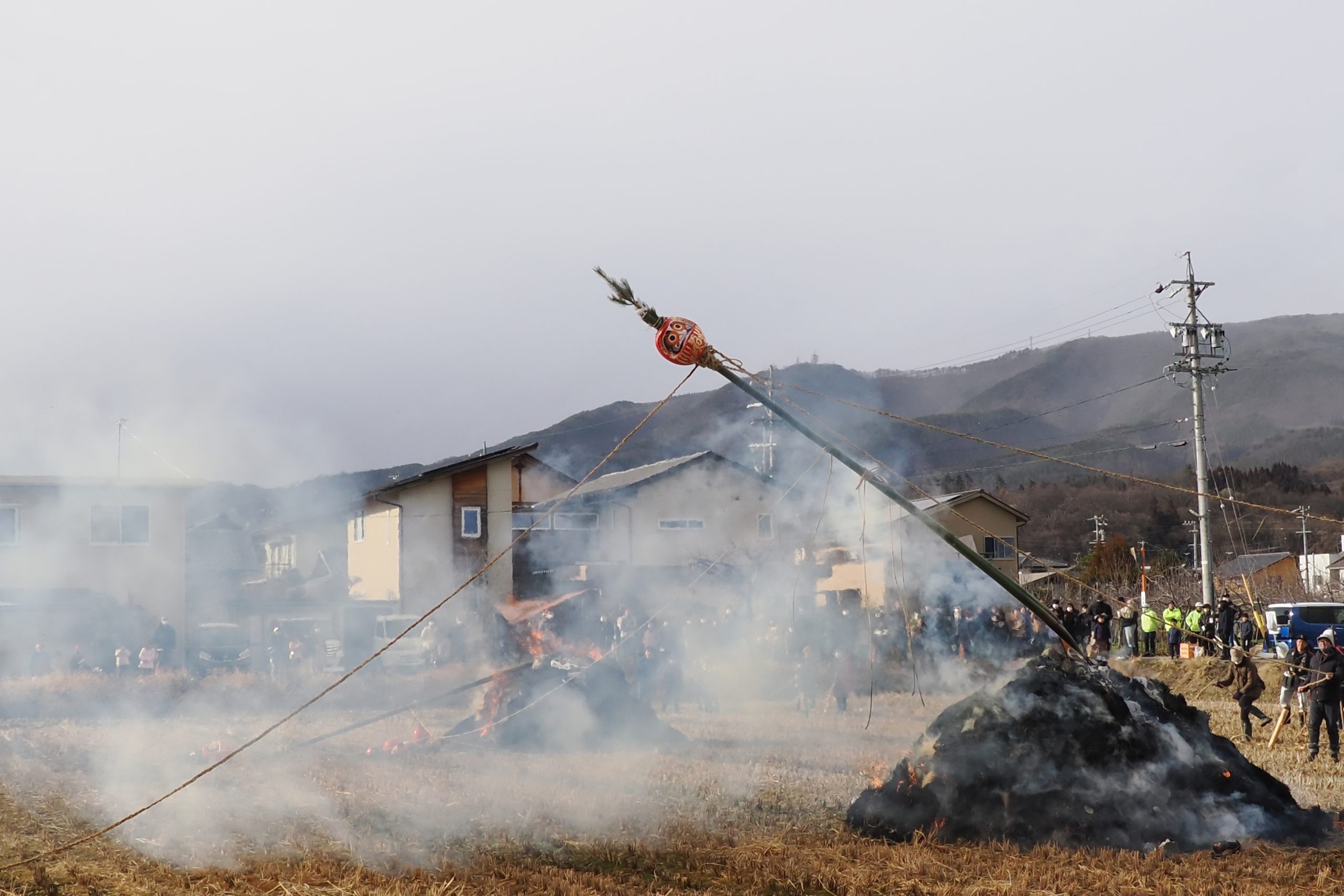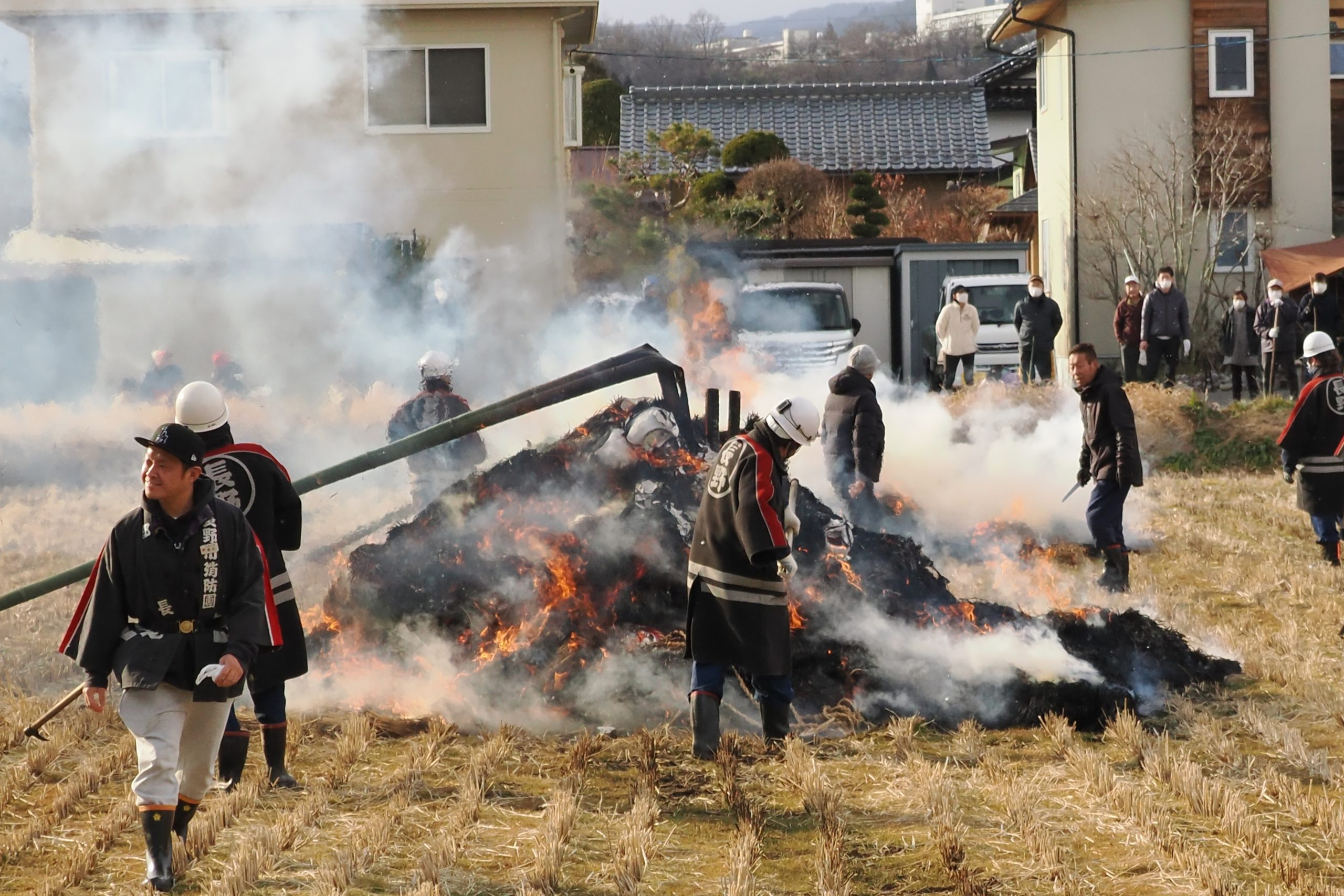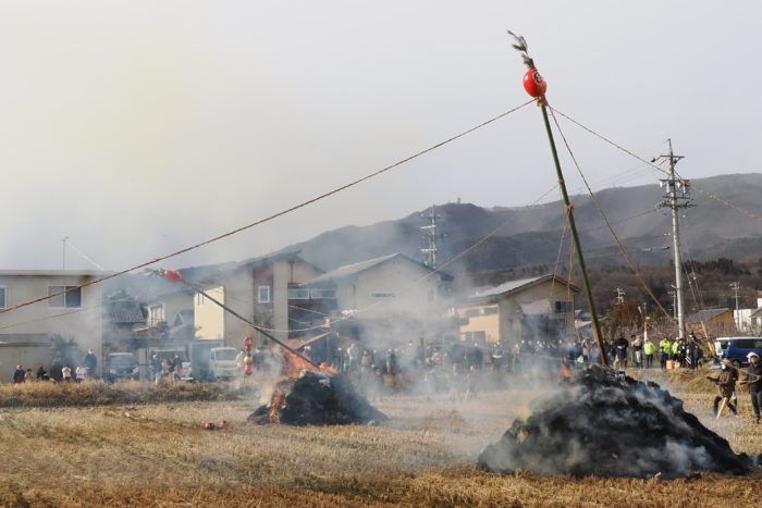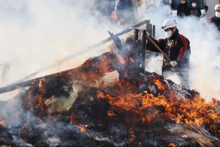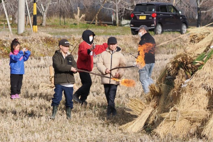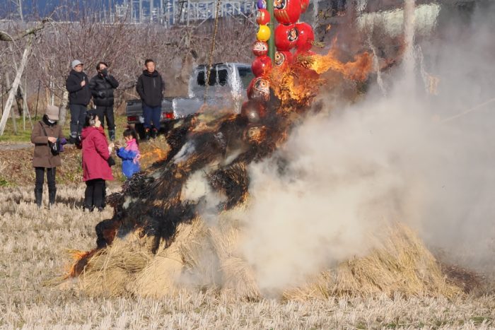しめった小雪が舞いましたが、滞りなくどんど焼きが行われました。 未明まで予報は雨でしたし、一日ずれていたら大雪でした。