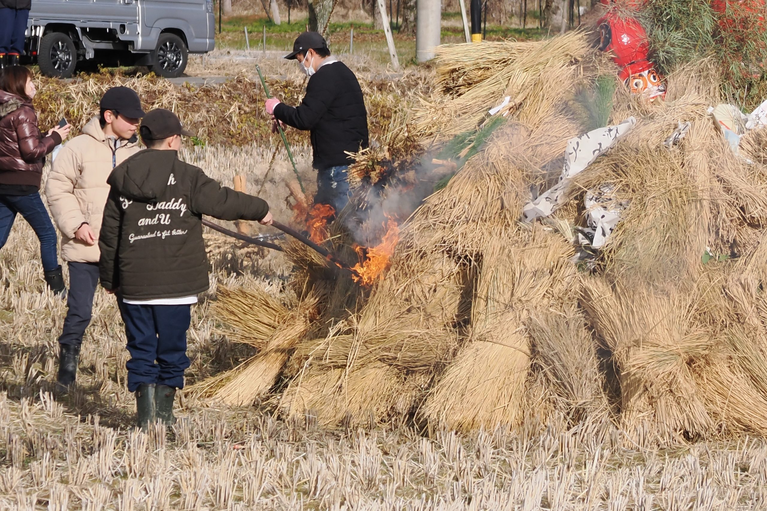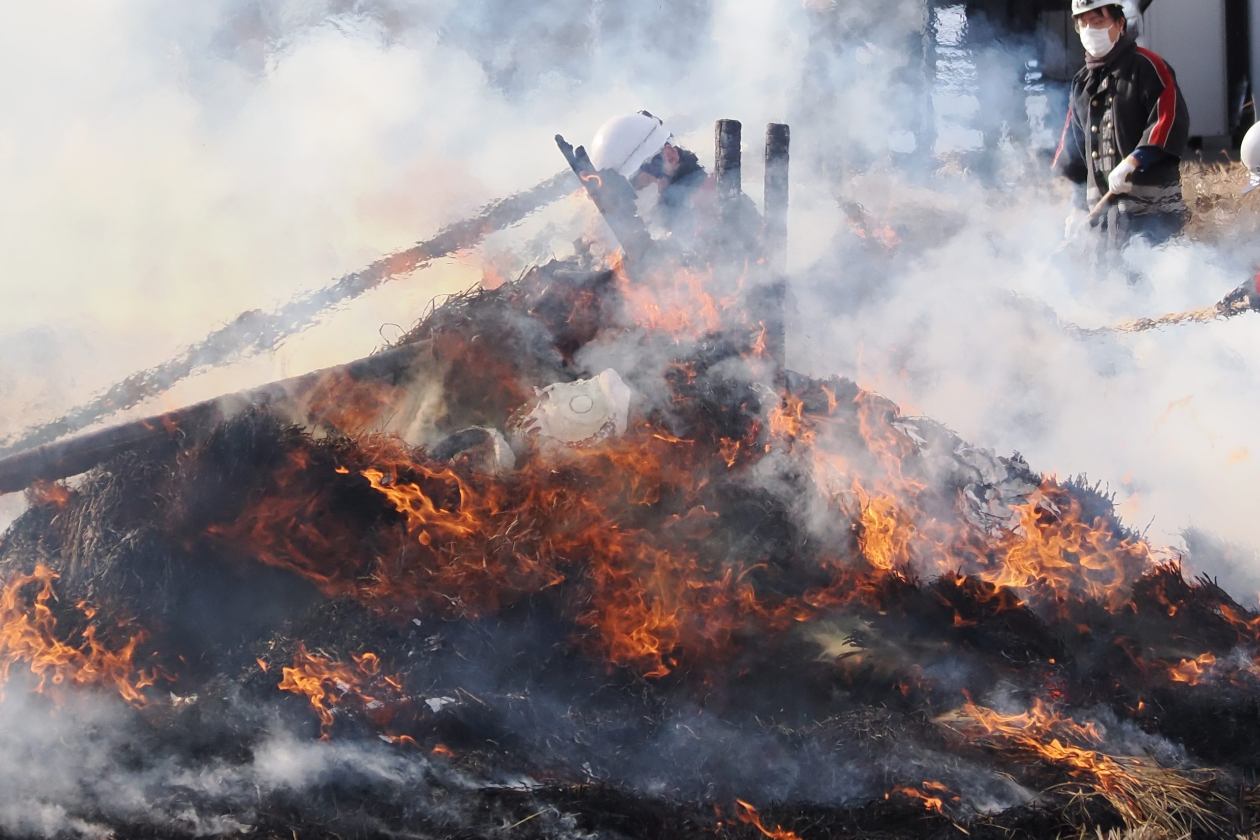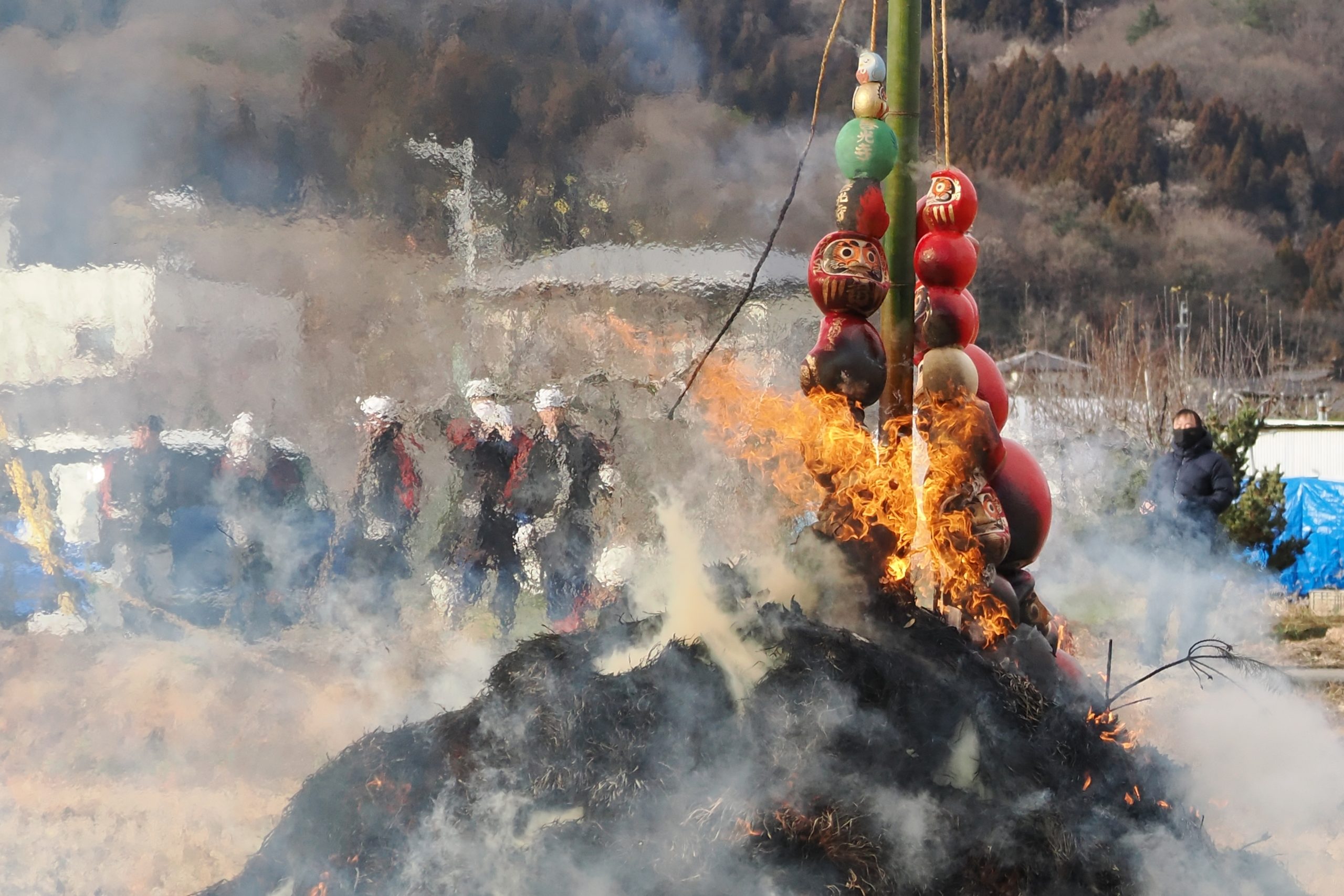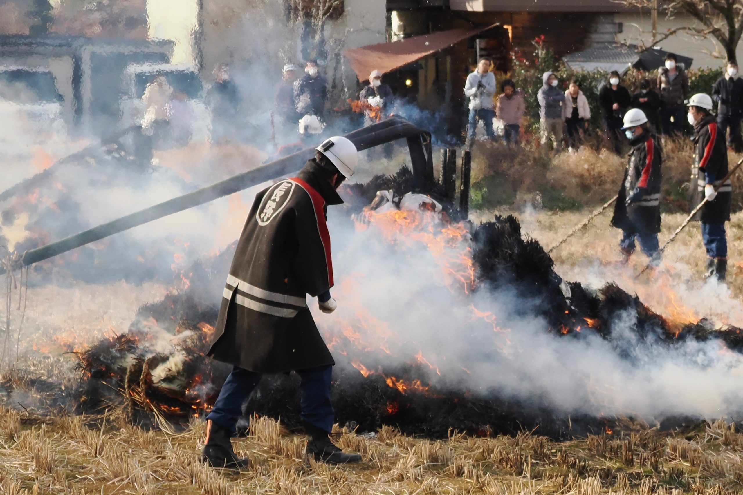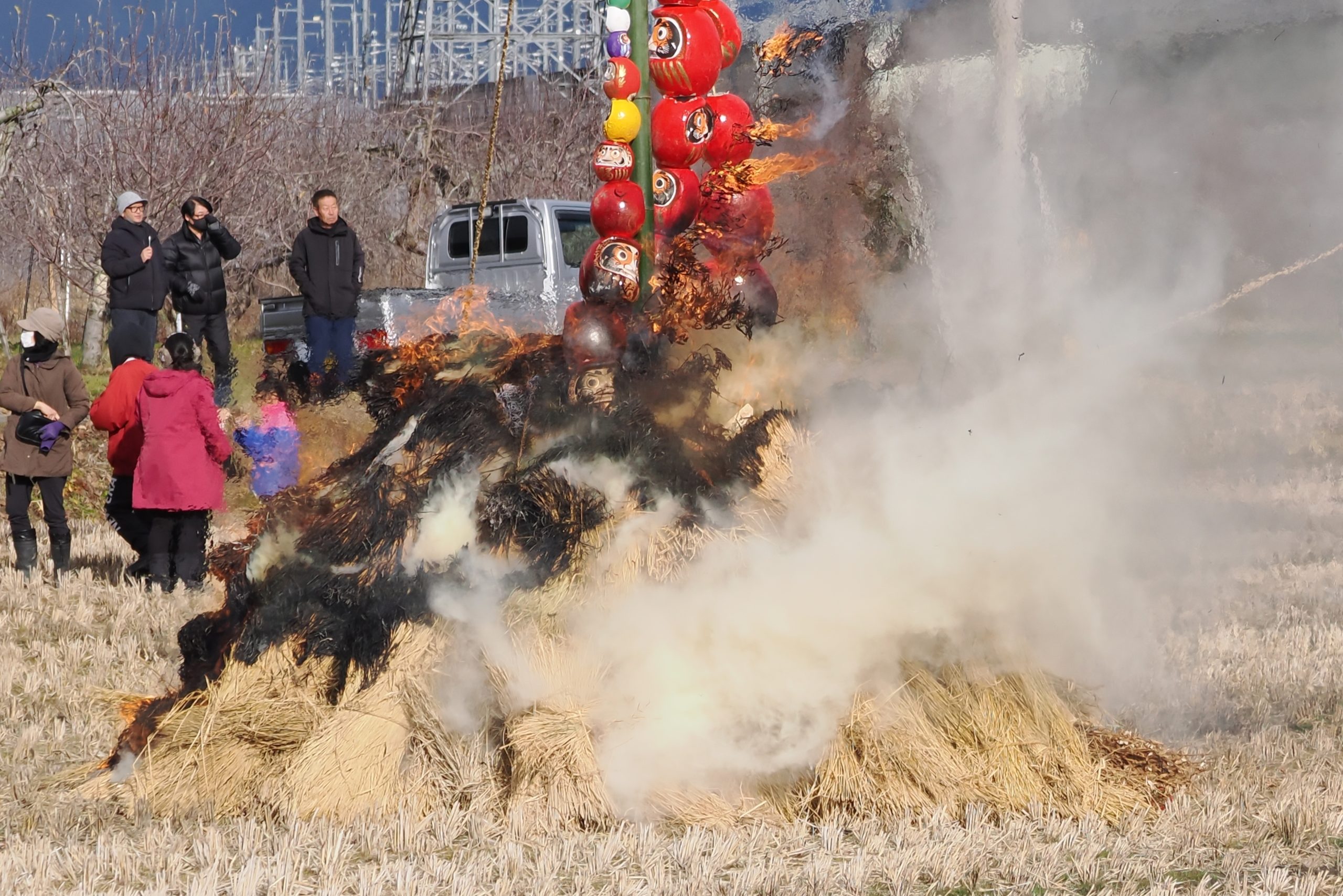 しめった小雪が舞いましたが、滞りなくどんど焼きが行われました。 未明まで予報は雨でしたし、一日ずれていたら大雪でした。